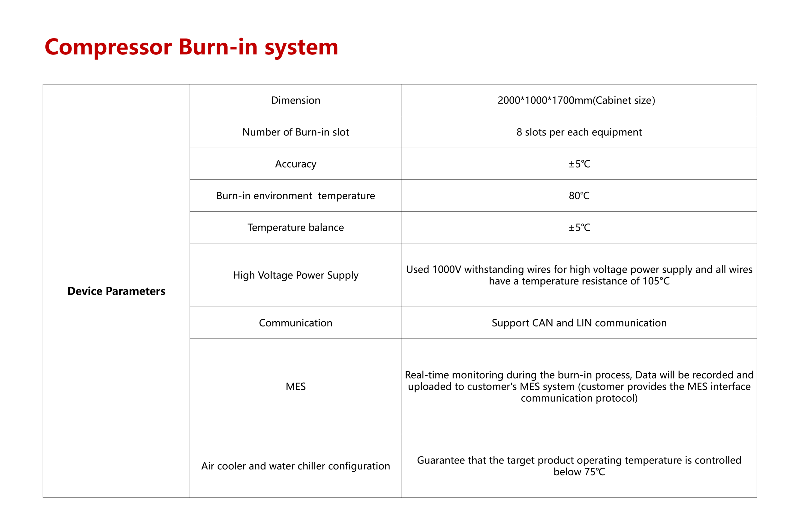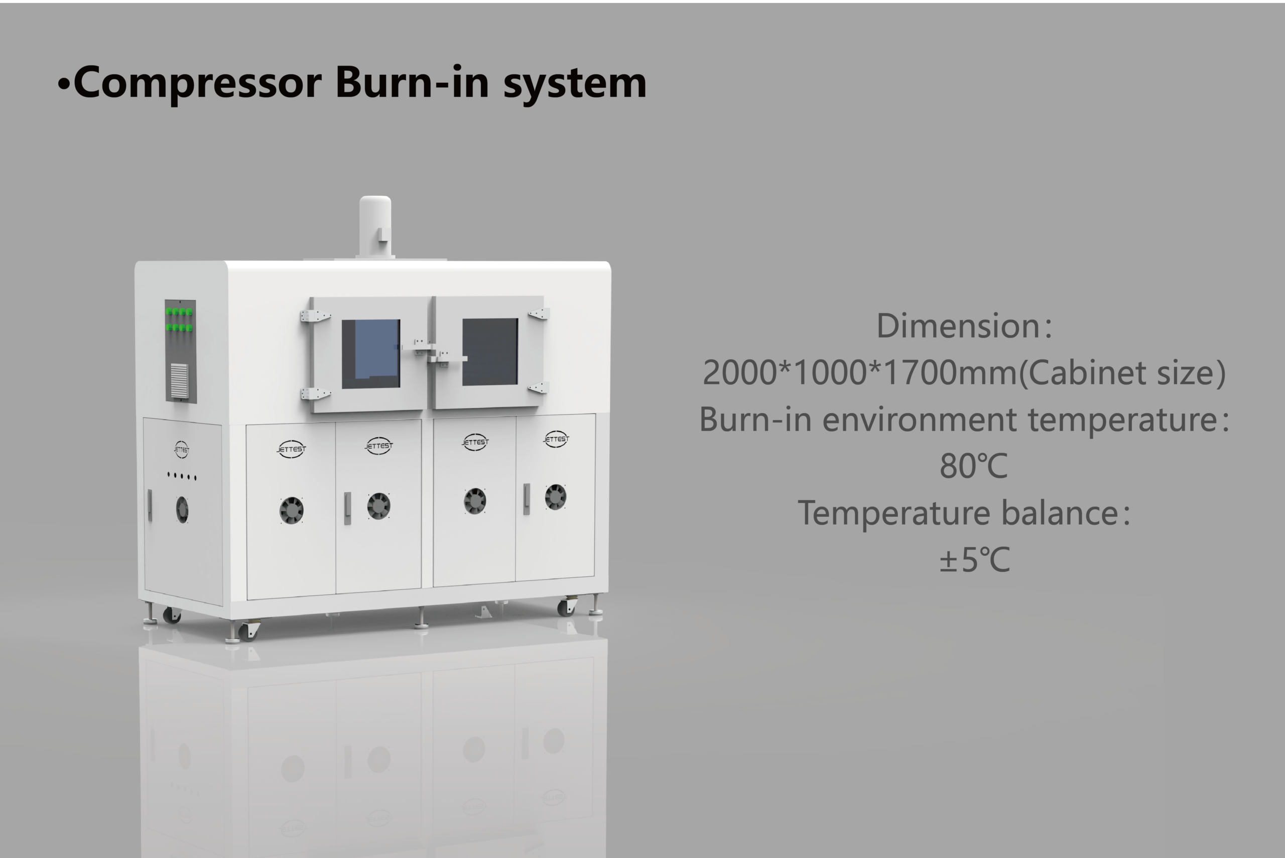 This system is designed for high-temperature endurance testing of compressors. It operates continuously at a constant 80°C, with real-time data monitoring and MES integration, to validate long-term operational stability and reliability.