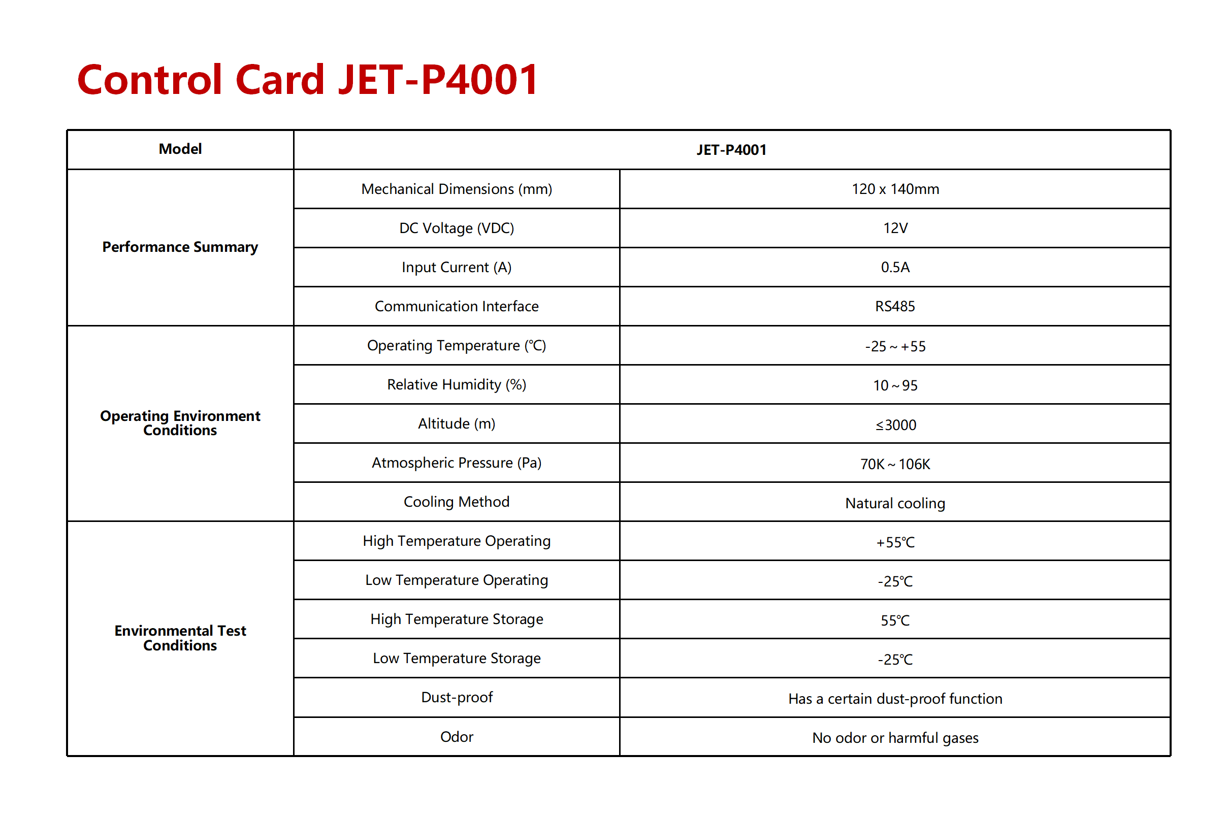 The JET-P4001 is an industrial control card utilizing RS485 communication. Designed for reliable operation in harsh environments from -25℃ to 55℃ with basic dust resistance, it is used for stable equipment control and signal transmission in industrial applications.