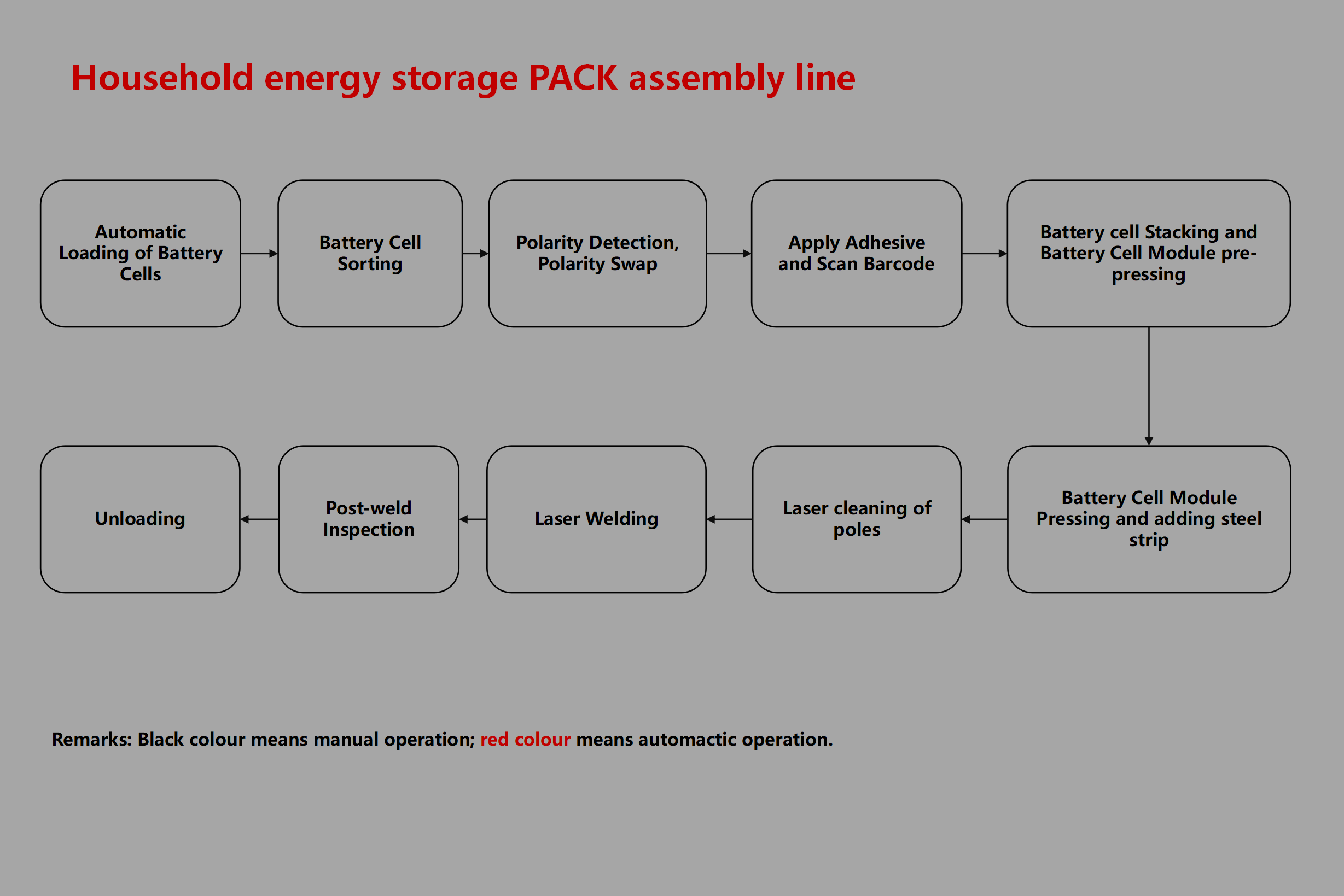 This assembly line is designed for the automated production of household energy storage battery packs (PACK). It ensures precise and efficient processing from cells to modules, guaranteeing product consistency and reliability for mass manufacturing.