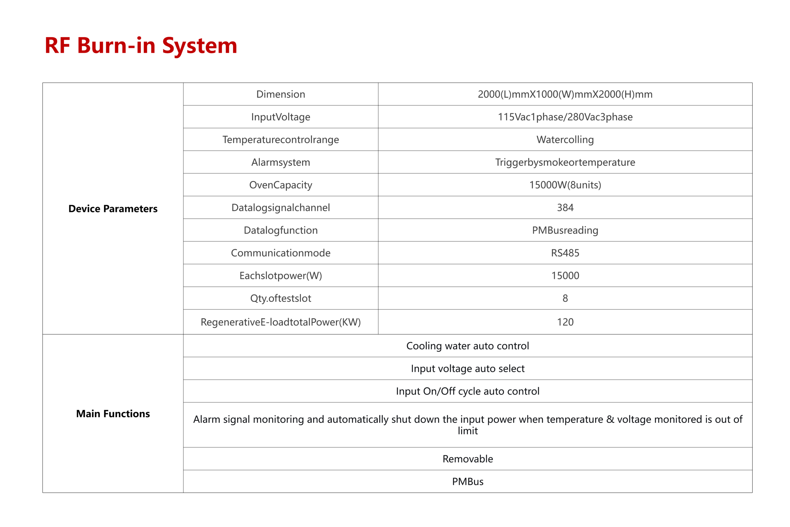 This system is designed for RF power supply aging tests, simulating high-frequency operating conditions for high-power endurance testing. It supports 8 high-power units operating simultaneously, ensuring long-term reliability under demanding conditions through water cooling and smart communication.